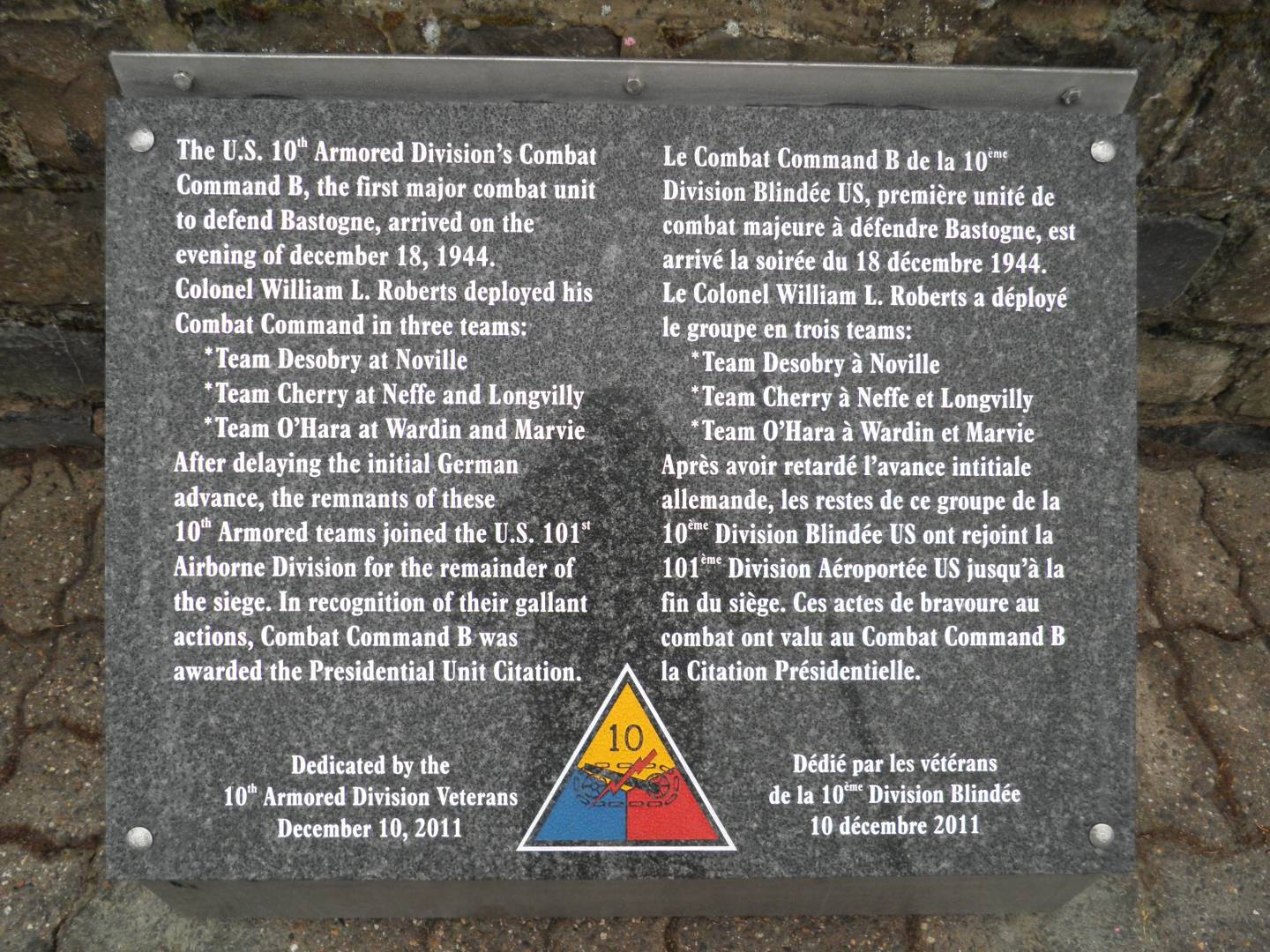 Bastogne, Belgium - December 10, 2011 – The combat actions of the U.S. 10th Armored Division in the defense of Bastogne during WWII’s Battle of the Bulge were recognized today with the placement and dedication of a plaque in the city where they boldly fought nearly 67 years ago. Regrettably, the actions of the 10th Armored during the battle have been largely neglected in history, while the 101st Airborne Division is often the lone unit credited for defending the town. The plaque will document and acknowledge Combat Command B of the 10th Armored Division as the first major combat unit to arrive in Bastogne and to defend the town during the initial hours of the battle.
